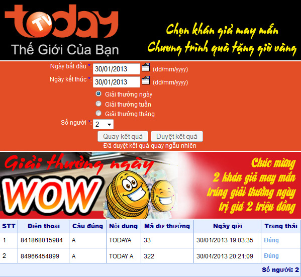 Chúc mừng hai khán giả may mắn trúng giải thưởng ngày 30/1/2013 của chương trình "Rinh lộc vàng đón Tết rộn vang" cùng TodayTV!