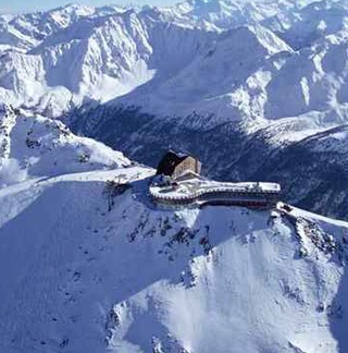 Berghotels Grawand, Italy (3.211 m). Khách sạn nằm chênh vênh giữa một vùng tuyết trắng, bao quanh là hàng chục ngọn núi cao hàng nghìn mét. Vào ngày quang mây, từ đây du khách có thể nhìn thấy hồ Garda - hồ lớn nhất Italy. |