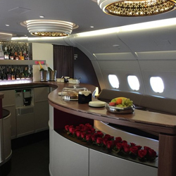 Hình ảnh khoang hạng nhất trên chiếc máy bay A380. Các ghế ngồi được thiết kế rộng rãi và được ngăn cách bởi các vách ngăn, giúp hành khách có được không gian riêng tư cũng như tránh được những ồn ào, rắc rối từ các vị khách bên cạnh.