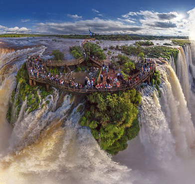 Thác Iguazu là ranh giới tự nhiên giữa Argentina và Brazil. Dòng nước đổ ụp xuống từ độ cao gần 100 m khiến Iguazu đẹp hùng vĩ với bọt tung trắng xóa.