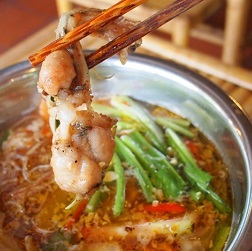 - Khi ăn, đun sôi nước lẩu rồi từ từ cho ếch, măng xào, rau vào, thưởng thức.