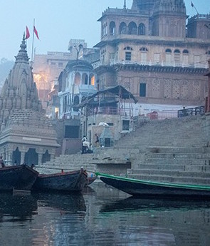 | Sương mù buổi sáng trên sông Hằng. Xa xa là những tòa tháp nghiêng ở thành phố Vanasari. |