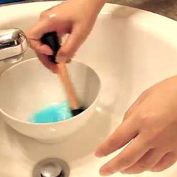Vệ sinh lần 1: Nhúng chiếc cọ vào nước rồi chấm vào dung dịch rửa. |