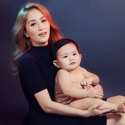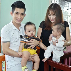 Vợ chồng Phi Thanh Vân bế con trai 8 tháng tuổi đi từ thiện