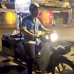 Trong trang phục giản dị, đội mũ bảo hiểm, ngồi trên xe máy dream chở “gian hàng di động” các món ăn nhanh, Trấn Thành khiến người hâm mộ thích thú.