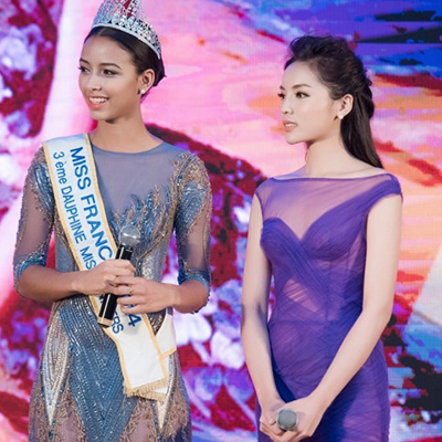 Tham dự buổi họp báo Hoa hậu Việt Nam 2016, người đẹp Nam Định xuất hiện khá muộn trong bộ váy dạ hội voan mỏng của Hoàng Hải.