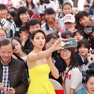 Dự sự kiện giao lưu văn hóa ý nghĩa, Hoa hậu Hoàn vũ Việt Nam 2015 thu hút trong bộ đầm cúp ngực tông vàng bắt mắt và gợi cảm.