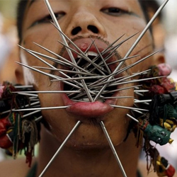Hàng trăm người đàn ông Thái Lan đã đâm những chiếc que nhọn, những lưỡi dao lớn và thậm chí là cả nòng súng qua hai bên má, nhằm ăn mừng lễ hội ăn chay hàng năm của người dân nước này.