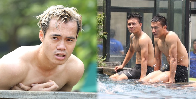 Tuyển thủ Olympic Việt Nam đùa giỡn bên bể bơi sau trận bán kết
