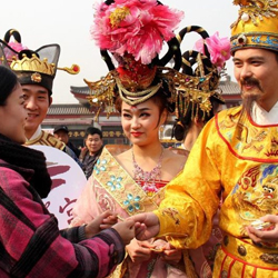 Nhóm người mặc đồ cổ trang phát bao lì xì đỏ ngoài sân ga đã thu hút sự chú ý của nhiều người dân.
